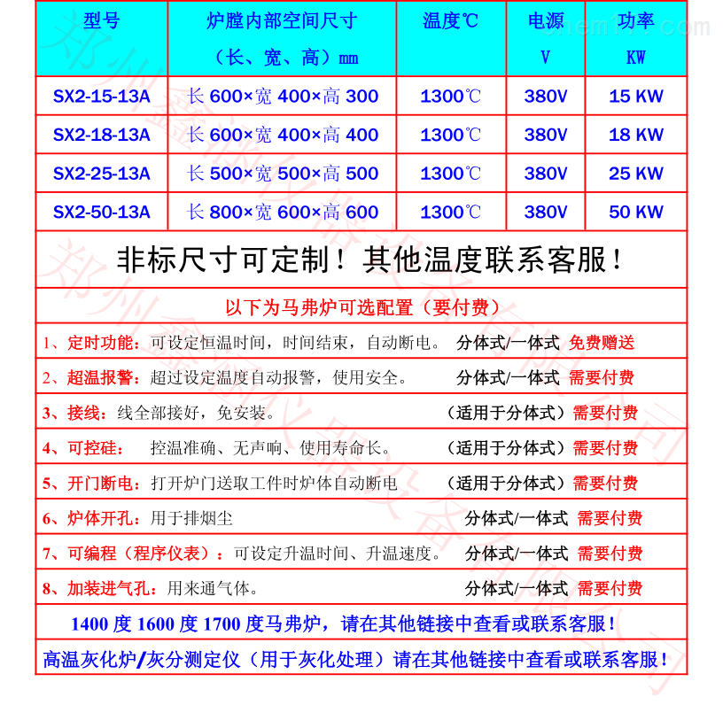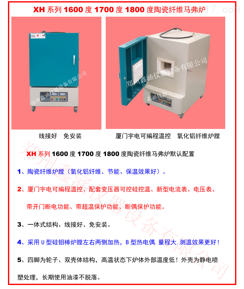 大型馬弗爐價格產品特點:爐襯使用真空成型高純氧化鋁聚輕材料,蓄熱量小保溫效果,節能減排,沒有污染;以含鉬電阻絲為加熱元件,長期電爐用于1100度;雙層爐殼,降低箱體表面溫度;K型雙鉑銠熱電偶;控溫系統工業精度0.2級智能儀表,PID智能50段溫控系統,并配有過溫、斷偶、過流保護等功能。
